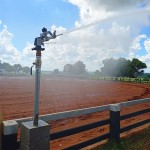 Projeto técnico de um sistema de irrigação para pista de hipismo, com medida média de 80 x 40m.Sistema com aspersores canhões setoriais, aspersores es..